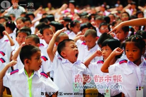 月1日,广州文德路小学开学典礼,一名一年级新生一边敬礼一边打哈欠。