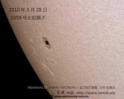 这是昨天刚刚从太阳背面转过来的1059号黑子,由于还在太阳的边缘,所以黑子附近的亮斑很明显。这张是在窗口 ... ccce 发表于 2010-3-28 16:58 登录/注册后可看大图