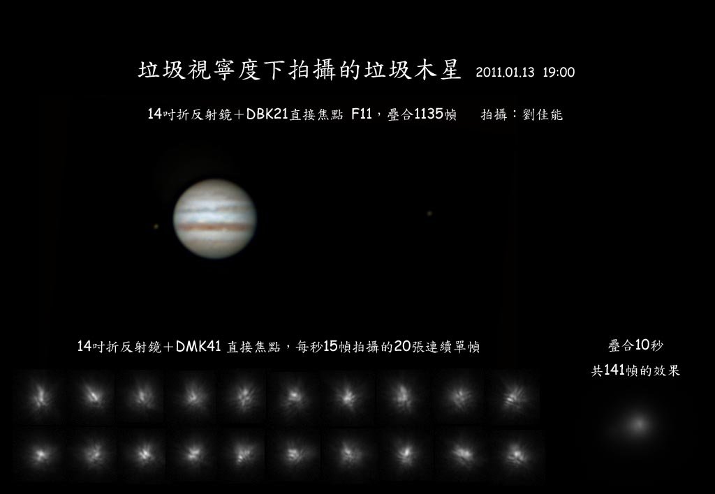在直接焦點下,我拍攝了天上一顆大約是2等的星用作比較效果,你們看到的20個單幀是這星的連續視頻截圖(每秒拍攝15幀),右邊是10秒共141幀的疊合原圖,沒有做圖像處理,即使處理也沒有用。 好一個爛seeing!