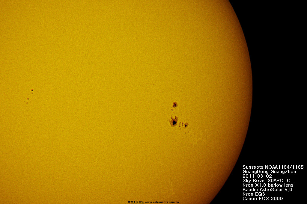 需要H-alpha滤镜才能看到日珥。 starimpact 发表于 2011-3-2 21:33 登录/注册后可看大图
