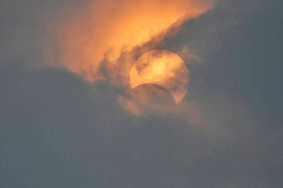 即将食甚的时候,居然没有什么云层遮挡,也就几秒钟的时间里,连拍几张,之后太阳又被云层遮住了,不过还是很激动,一张完美的食甚照片 用另一台相机拍的