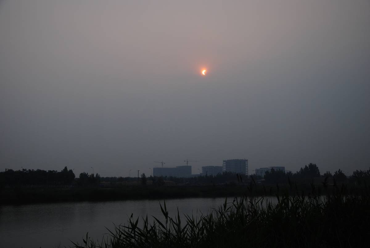 5点30分赶到预先选好的北东南均很开阔的一片空地,傻望东方铅黑云层遮盖的天空,啥也没有,不见太阳,于是坐在车里听音乐。大约7点40分的时候,偶然抬头看了一下天空,太阳居然隐隐地现出来了,暗红色,已经被月亮遮盖了一部分。