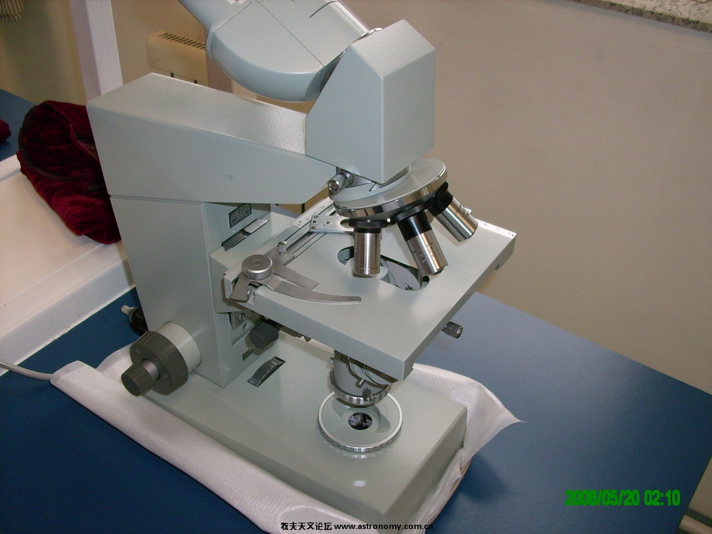 下午给您通过电话后,我又试了下90倍的那个镜头,仍然离载玻片有3-4毫米的距离,这90倍的镜头上面有个HI的字母,看来应该是个高倍镜!您配的镜头里,只有那个20倍的镜头可以接触到玻片,甚至可以触到载物台,其他的都离得有段距离,今晚我把相机充电了,老师锁了实验室的门,明天我一早照些镜头和载物台的图片,重点放在载物台升到最高处,依次调节镜头,看与载物台的距离。我们看片子,要求一手移动载物台旋钮,一只手按计数器,一般10倍物镜调节清楚后,看骨髓的增生程度,然后转到40倍物镜,看粒细胞系、红细胞系、巨核细胞系、淋巴细胞系的情况,遇到病态的细胞,转到油镜看是什么地方病态,所以10-40-100,根本不用移动载物台的上下,几乎在一个平面,必要时转动细螺旋就可以看清细胞里分层的微细结构,一般显微镜还有锁紧结构。就是为了看清粒细胞里的AUER小体,某些是单个、成从、粗细等!对鉴定白血病有特异的效力!明天我再拍老师让我用的那台OLYMPUS CH系列显微镜的10-40-100的对比图!为了节约,我就不拍老师用的OLYMPUS高级机型了!但给你拍个老师显微镜大致的图片给您!干我们这个的,显微镜要求光源(不能是黄色的,要加蓝色滤光片的),片夹、镜头、还有移动推尺、粗和细聚焦旋钮联合配合的!在您给我配的油镜头,按动油镜头,木有伸缩性,物镜头里直径不一,显微镜光源灯泡两只灯丝有乌黑征象,现在我是这样想的,明天拍完图,让您看看物镜的情况,片夹的情况,看您能不能给调换个理想的!(只要求10-40-100倍物镜理想,能够得着玻片,片夹能牢固的夹住玻片,您的那个片夹,带弹性夹子的那头本身就有一个横的抓,再加一个弹性夹,您再配一个活动的抓,就算把那边固定死,它们质检夹的玻片也是斜的,明天我给您照一下,您就会明白的!还有那个活动的抓,上面有3个眼子,您在其中一个眼里上了螺钉,“一”字花纹已快平了,中间是个小小的眼,右边空着的眼下方有一个螺纹眼,但错位,螺丝拧不进去,那个活动的抓是个铝的,---所以周围的老师你一句、我一句,说的我面红耳赤,如果是一个小问题,我自己还可以应付!但是这么多问题,我无法处理了!昨天拿出显微镜时,只有一个老师说了一句,卖东西的也不知道在显微镜外套个塑料袋,要是泡沫粒进入了光路就麻烦了!今天没有说优点的,还有老师说,瞧不起日本的和国产的,这下德国的也不行了吧等等!